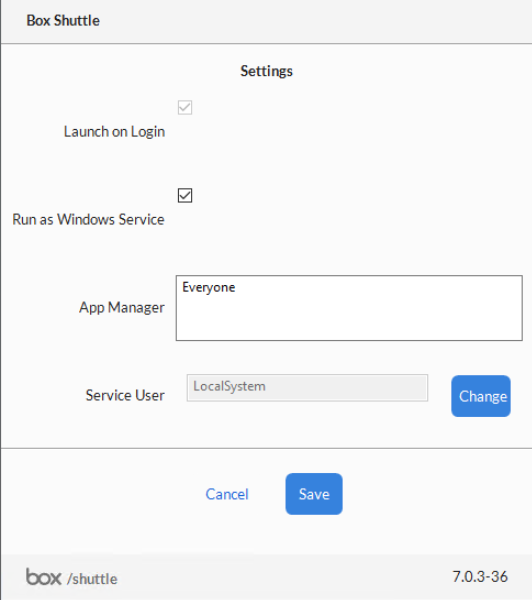 Box Shuttle Windows Agent runs as an application by default. However, in the Windows environment, when a user starts an application and then logs out, the application shuts down and data transferred by it also stops.
