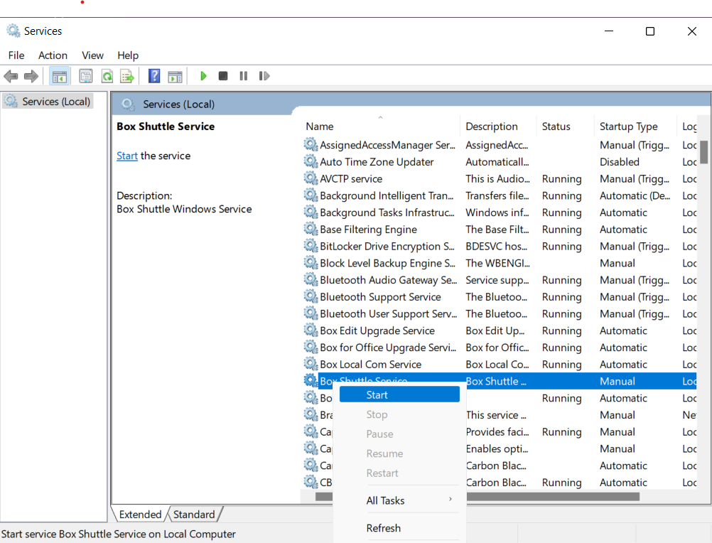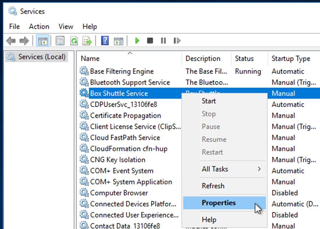 LocalSystem, close the error dialog and select the Change button from the system tray pop-up. - The Services window displays. Find the Box Shuttle Service in the list, right-click and select Properties.