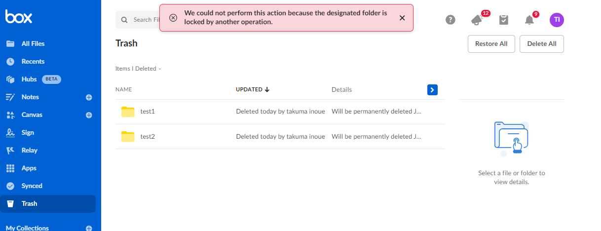 When clicking Delete All to remove folders from the trash, an error may occur with the following message: “We could not perform this action because the designated folder is locked by another operation.”
