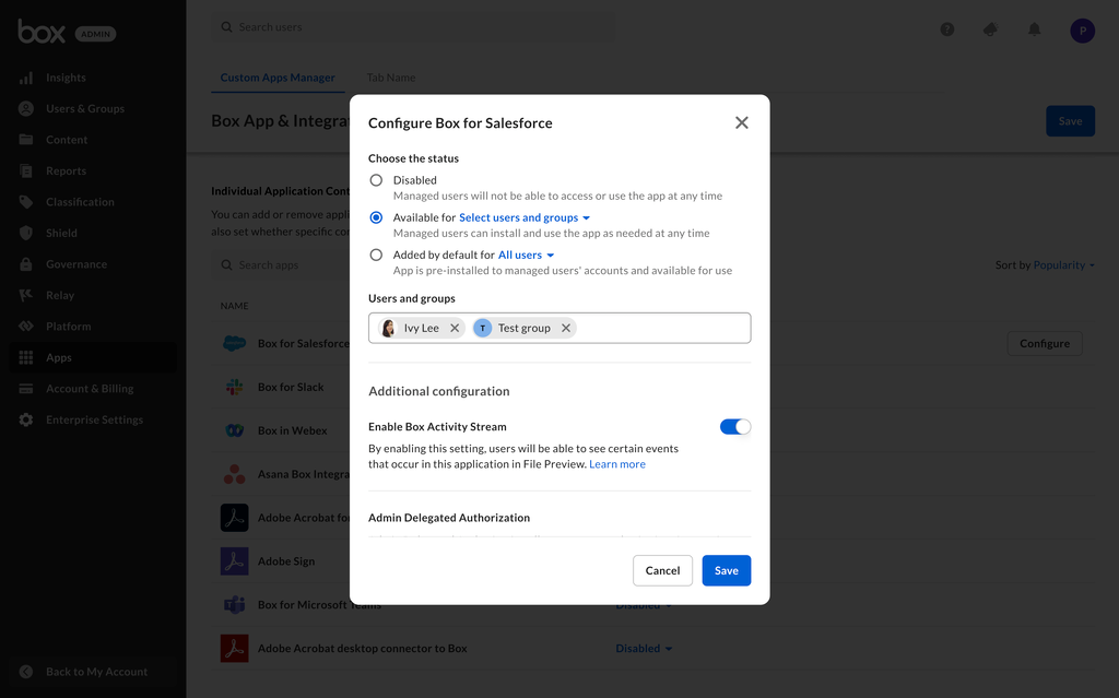 Currently Box admins can control which integration apps can be used at their enterprise, applicable to all managed users.
