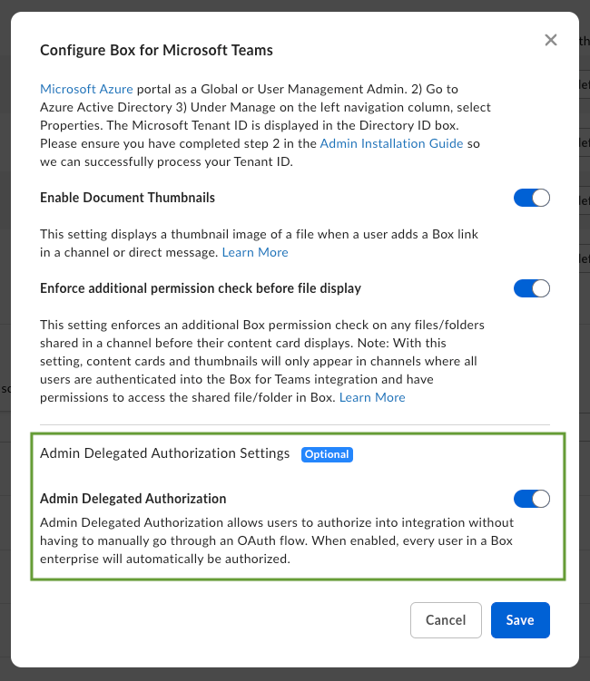 Our partnership with Microsoft has always centered around making your secure content easier to work with, we’re excited to continue this trend by bringing Admin delegated authorization to Admins using Box for Teams. Currently, using this integration empowers your teams to view, share, collaborate, and manage Box files, both internally and externally, all within Microsoft Teams. However, Box for Teams users have to authorize their Box account every time they logged in.