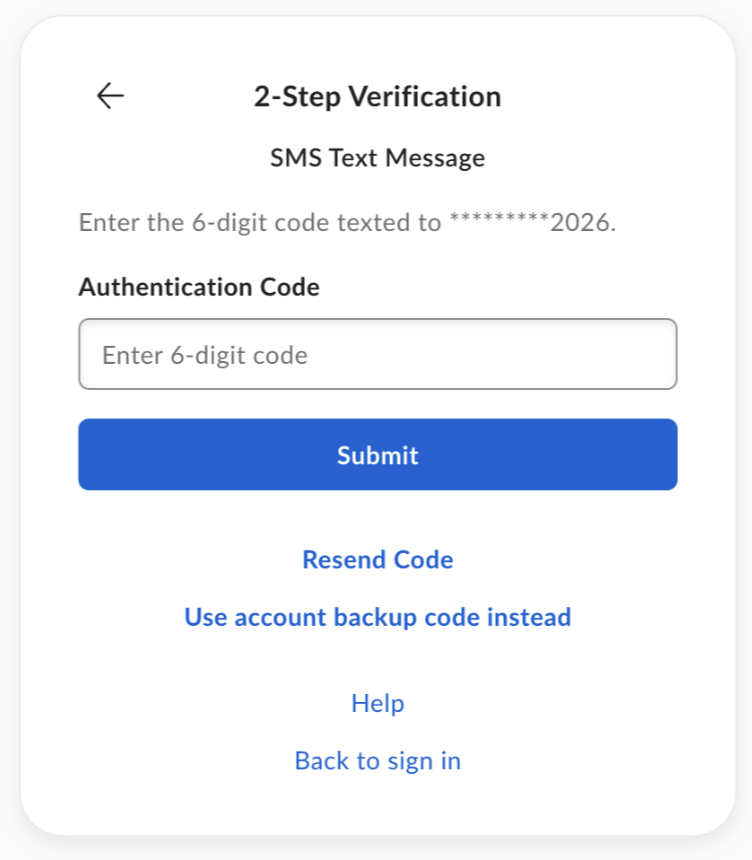 Two-step verification (sometimes referred to as two-factor authentication) is an additional layer of security to protect your account. The first factor is your password. The second factor typically is a code sent to your mobile device via SMS or a voice call, or accessed from a security application. Enter this code after typing in your username and password. This further verifies your identity before the system grants you access to your data.