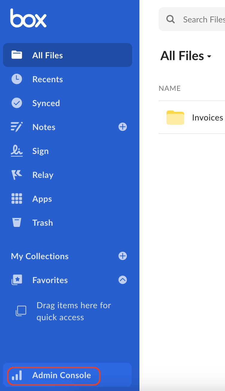 - Sign into your Box.com account as the Account Administrator. Locate Admin Console on the left side towards the bottom of the window