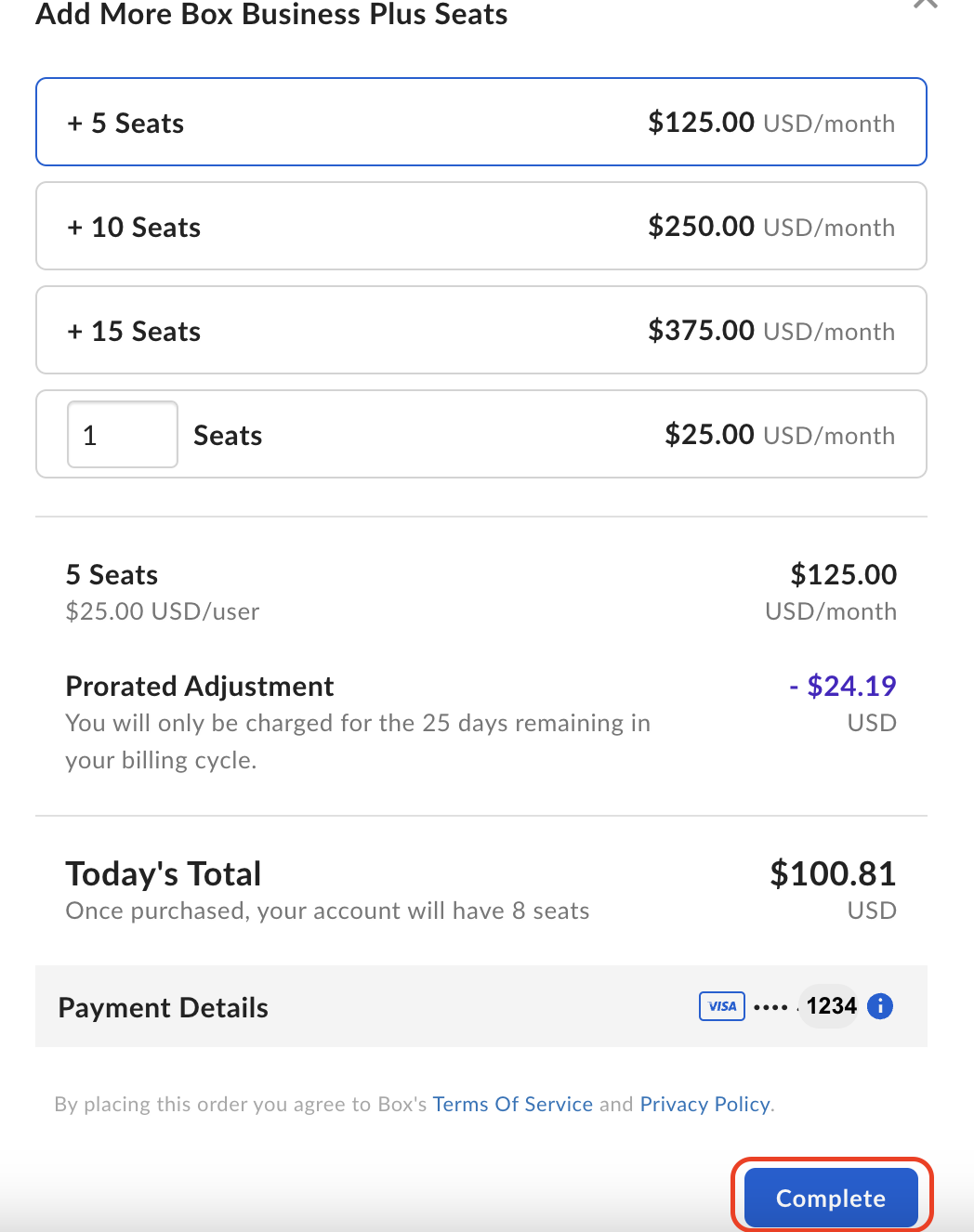 - The last selection allows you to customize the amount of seats you need. Click 'Complete' to complete your seat purchase.