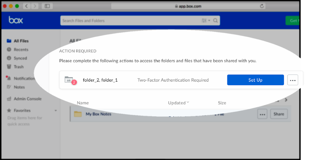 - In the pending invitations panel under ACTION REQUIRED, hover on the blocked file or folder, and click Set Up. Box displays the Set up 2-Step Verification window.
