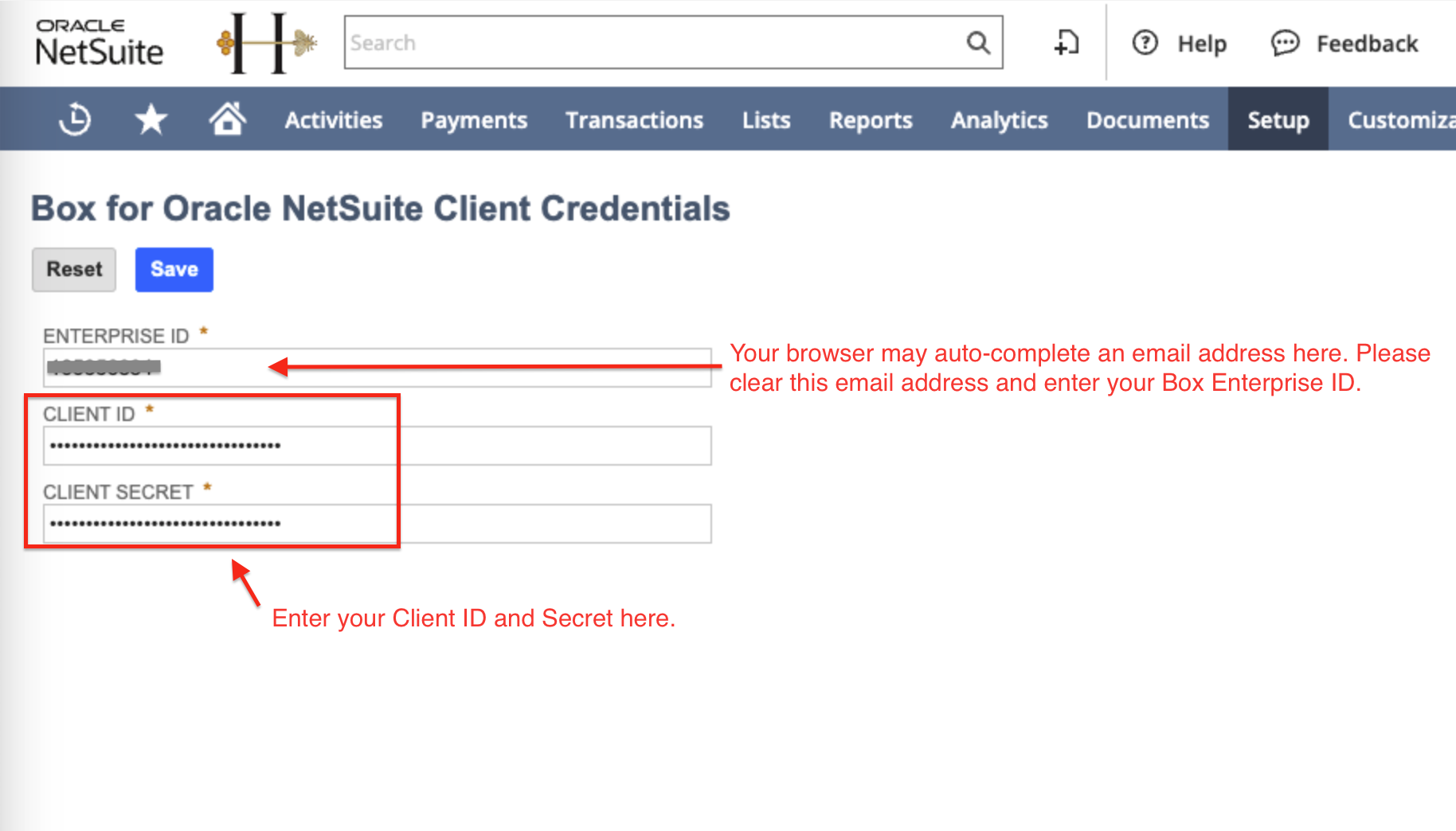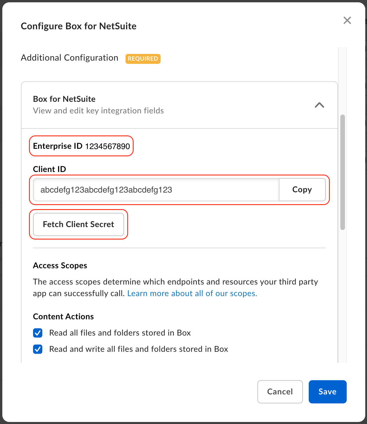 Enter your Enterprise ID, Client ID, and Client Secret from the Box Admin Console (the information noted from 1. (Box Admin) Add Integration Credentials to Box for NetSuite, step 8)