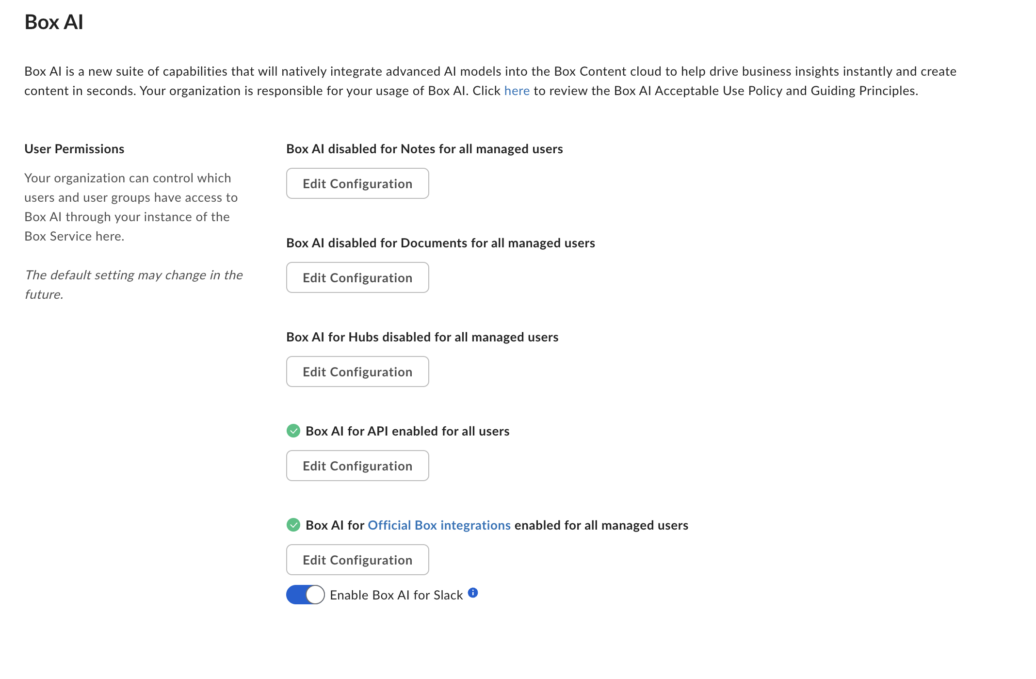With this addition, the detailed setup of the integration will still be available within Admin Console > Integrations > Box Integrations & Clients > Individual Integration Controls > Box for Slack.