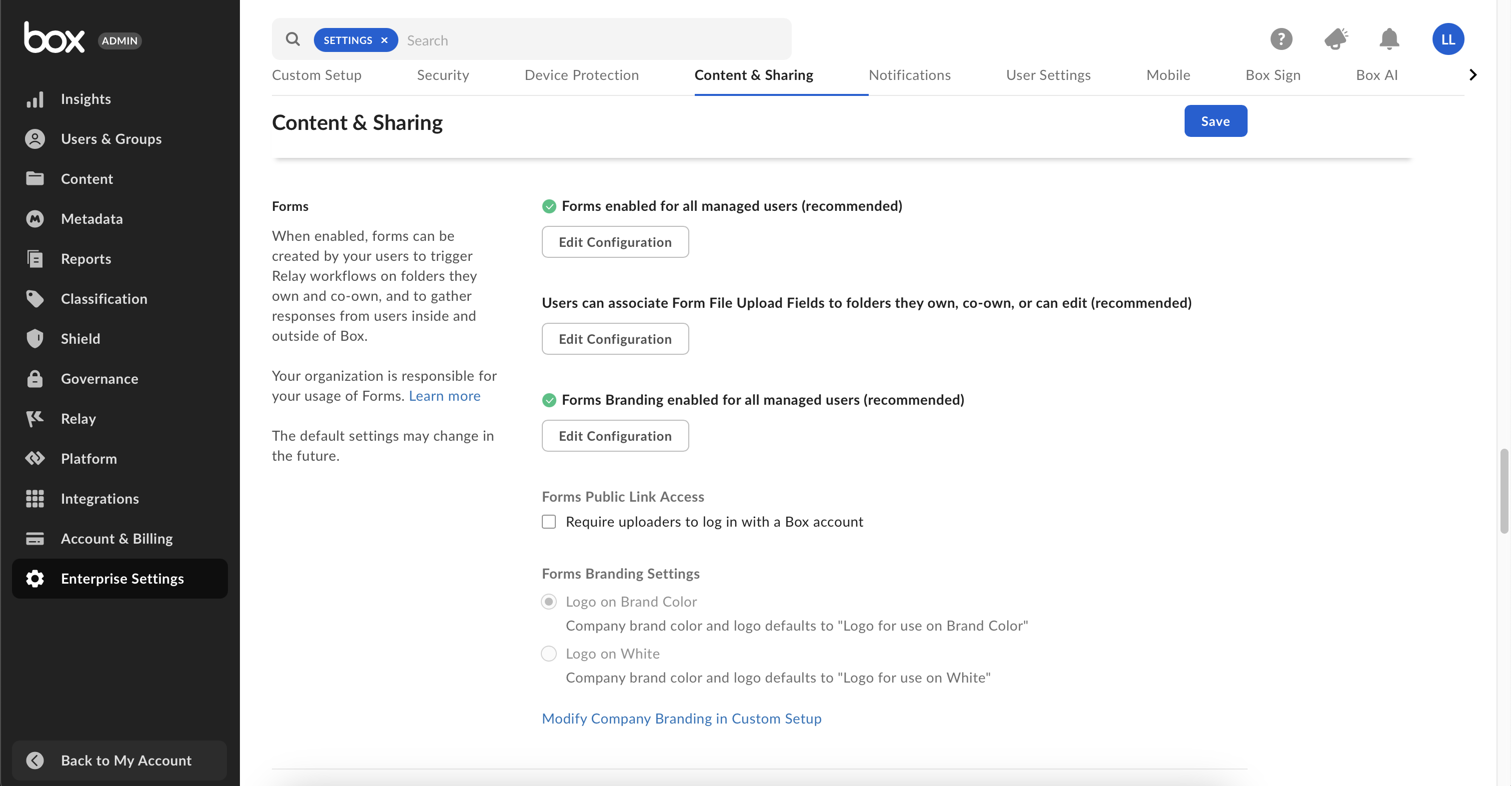 Admins can enable Box Forms for their organization by accessing the Admin Console, and then Enterprise Settings. In the Content & Sharing tab, scroll down to the Forms section and select Edit Configuration under Forms.