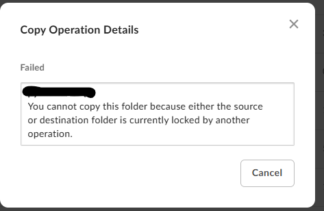 The error details show the message: “You cannot copy this folder because either the source or destination folder is currently locked by another operation.” -