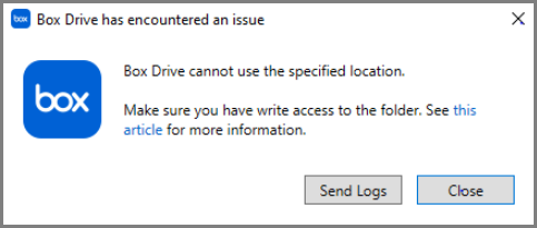 When attempting to launch the Box Drive app, users may encounter the error: “Box Drive cannot use the specified location. Make sure you have write access to the folder.”