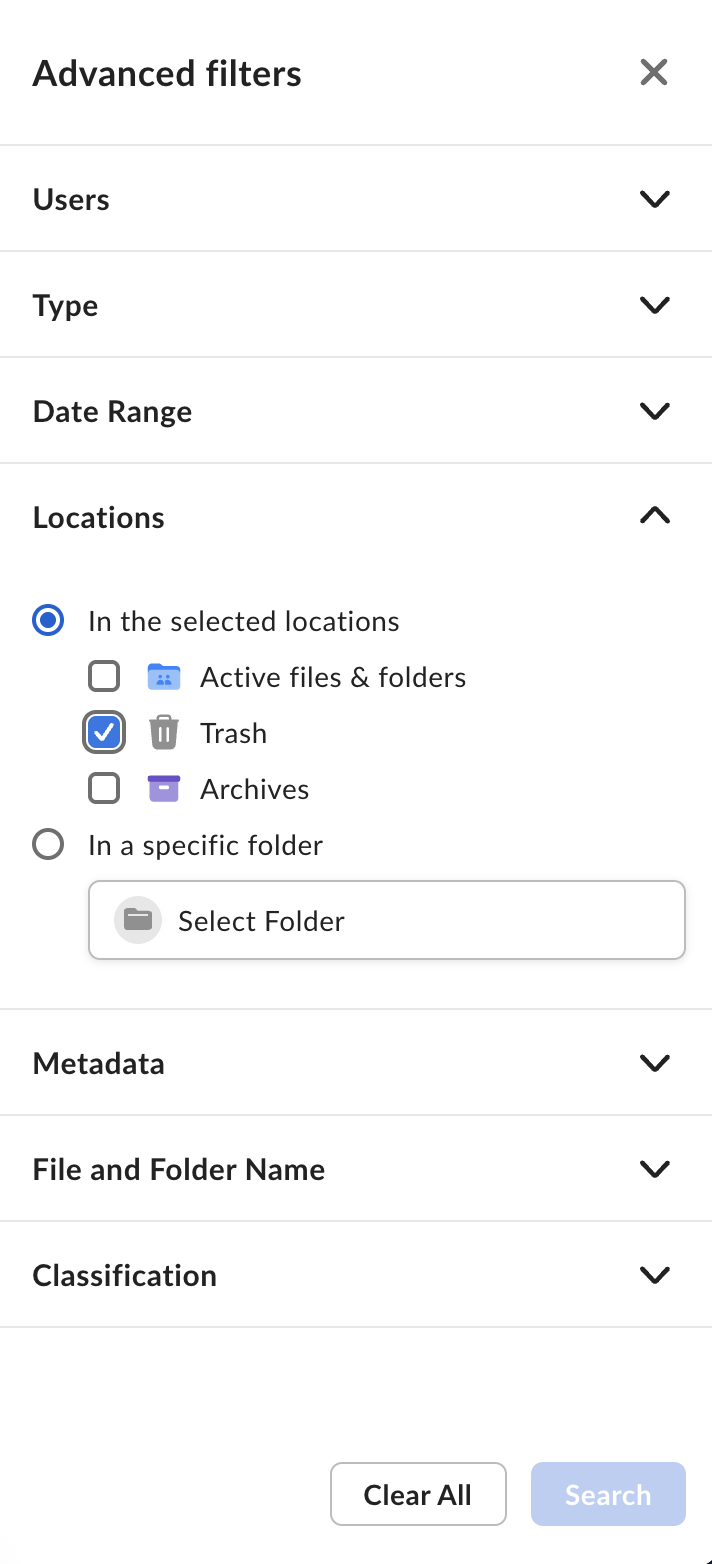 This filter allows Admins to select location type or a specific folder. For location type, Admins can select Active files and folders and Archive. For a specific folder, select Select Folder, and then search for and select a folder.