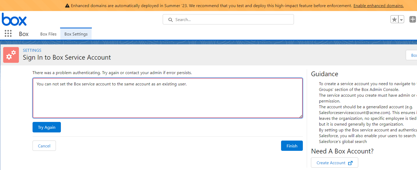 To resolve this error, ensure that you are using a different Box account for each Salesforce account. If the Box account you intend to use as the Box Service Account is already being used as a Box User Account, you will need to log out of that user account.