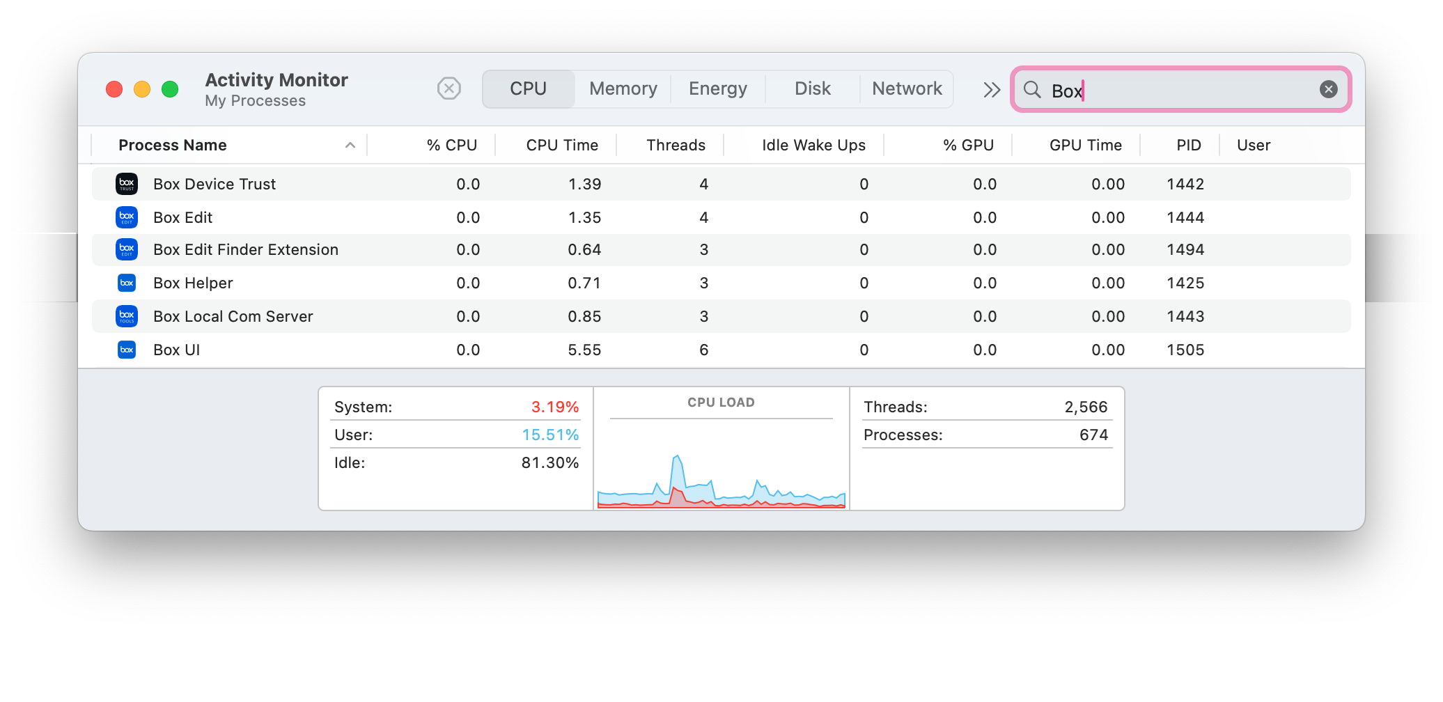 Box. - Confirm that two processes are running: Box Edit and Box Local Com Server.