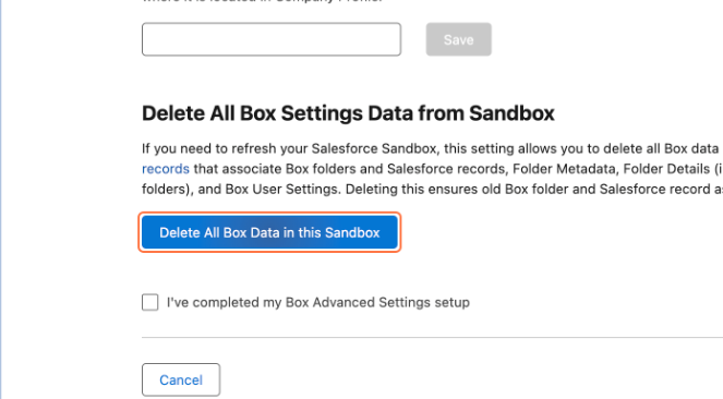 In order to delete all Box setting data from a sandbox, navigate to the Box Settings tab > Advanced Setup > Advanced Settings > Click on Delete All Box Data in this Sandbox button.