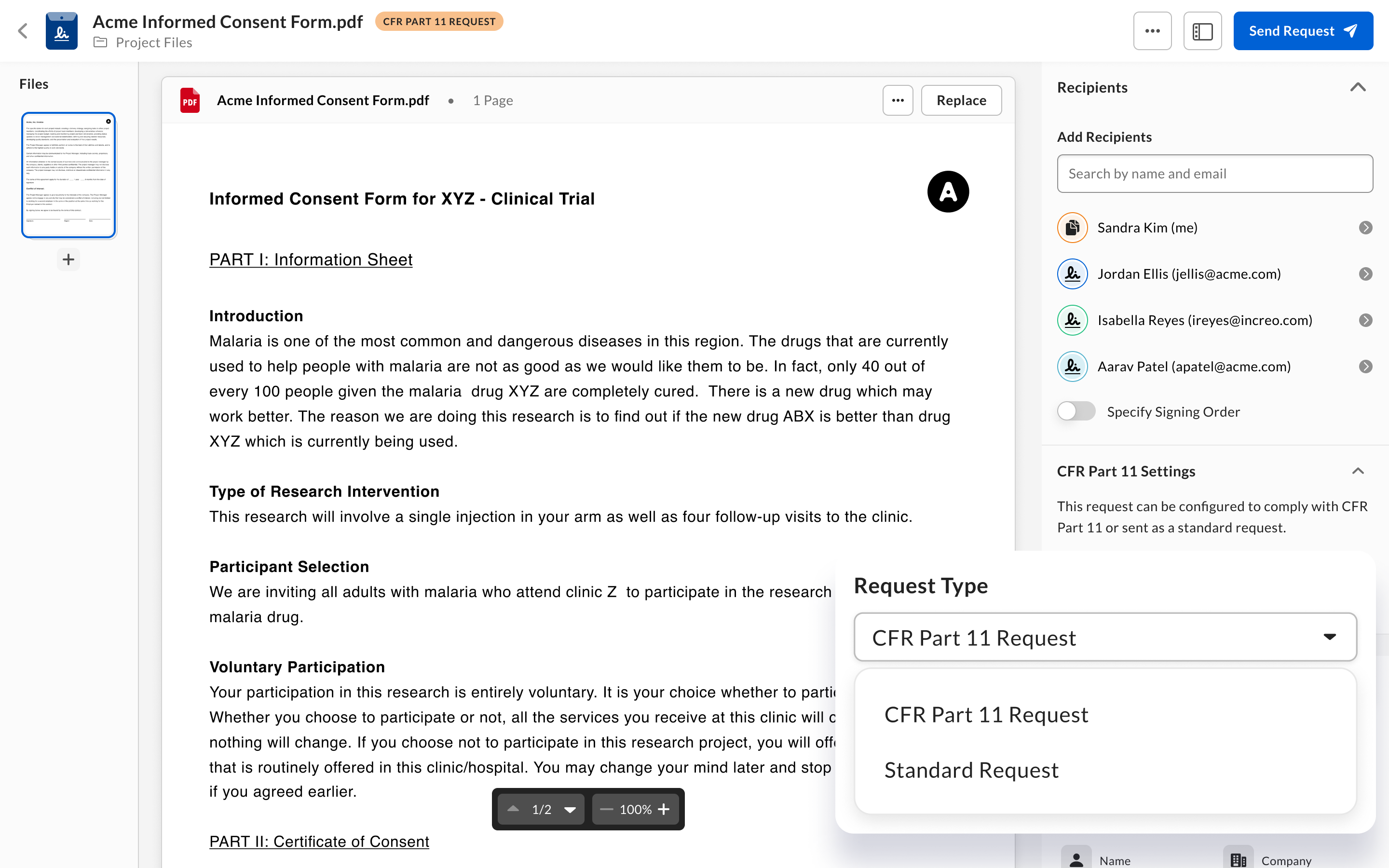 - GxP Validation Amins and Co-Admins who enable Box Sign for their enterprise will simultaneously enable their end users to choose between sending standard signature requests or 21 CFR Part 11 compliant signature requests by default. Users can select whether the signature request is a standard request or a 21 CFR Part 11 signature request from a dropdown menu available in the document preparation experience when sending out an ad hoc signature request or when configuring and using a reusable template.