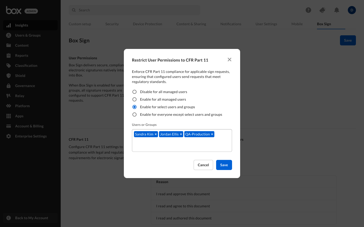 - Along with changes to the default Box Sign enablement settings, GxP Validation Admins and Co-Admins can now restrict certain users and groups to only send 21 CFR Part 11 compliant signature requests, ensuring their users remain in compliance with 21 CFR Part 11 guidelines for electronic signatures when initiating signature requests.