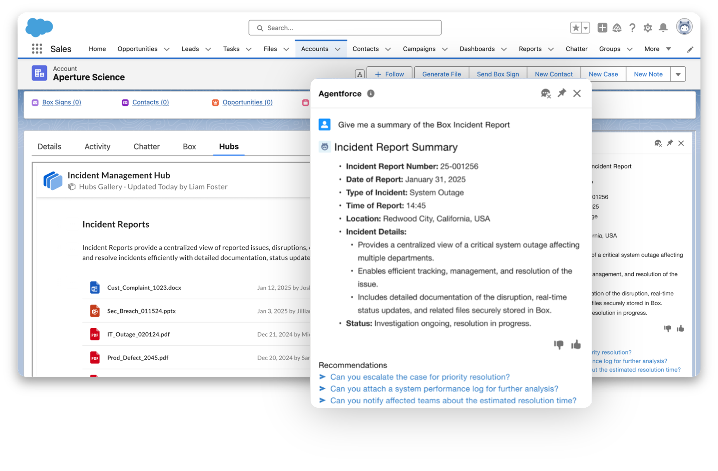 In March, we released a series of pre-built and customizable Agentforce actions for Box content, including file sharing, Box Sign e-signature initiation with Salesforce data auto-population, document generation from templates using Salesforce object data, and object-tied folder structure creation.