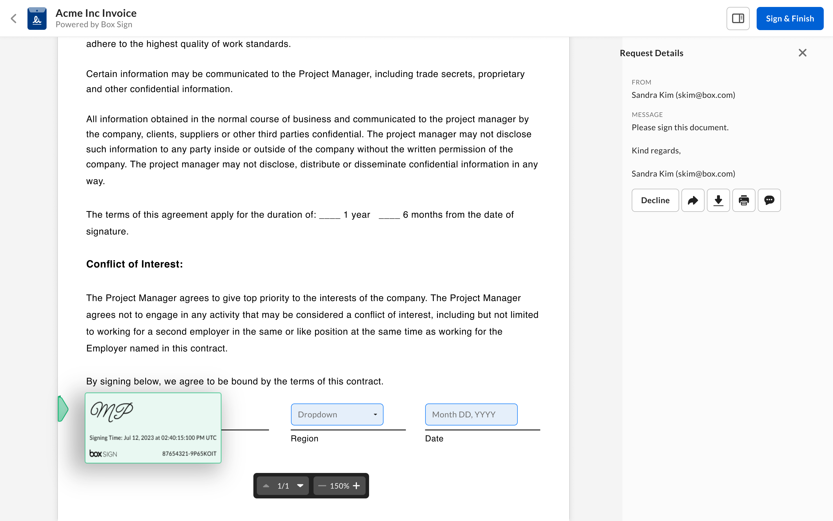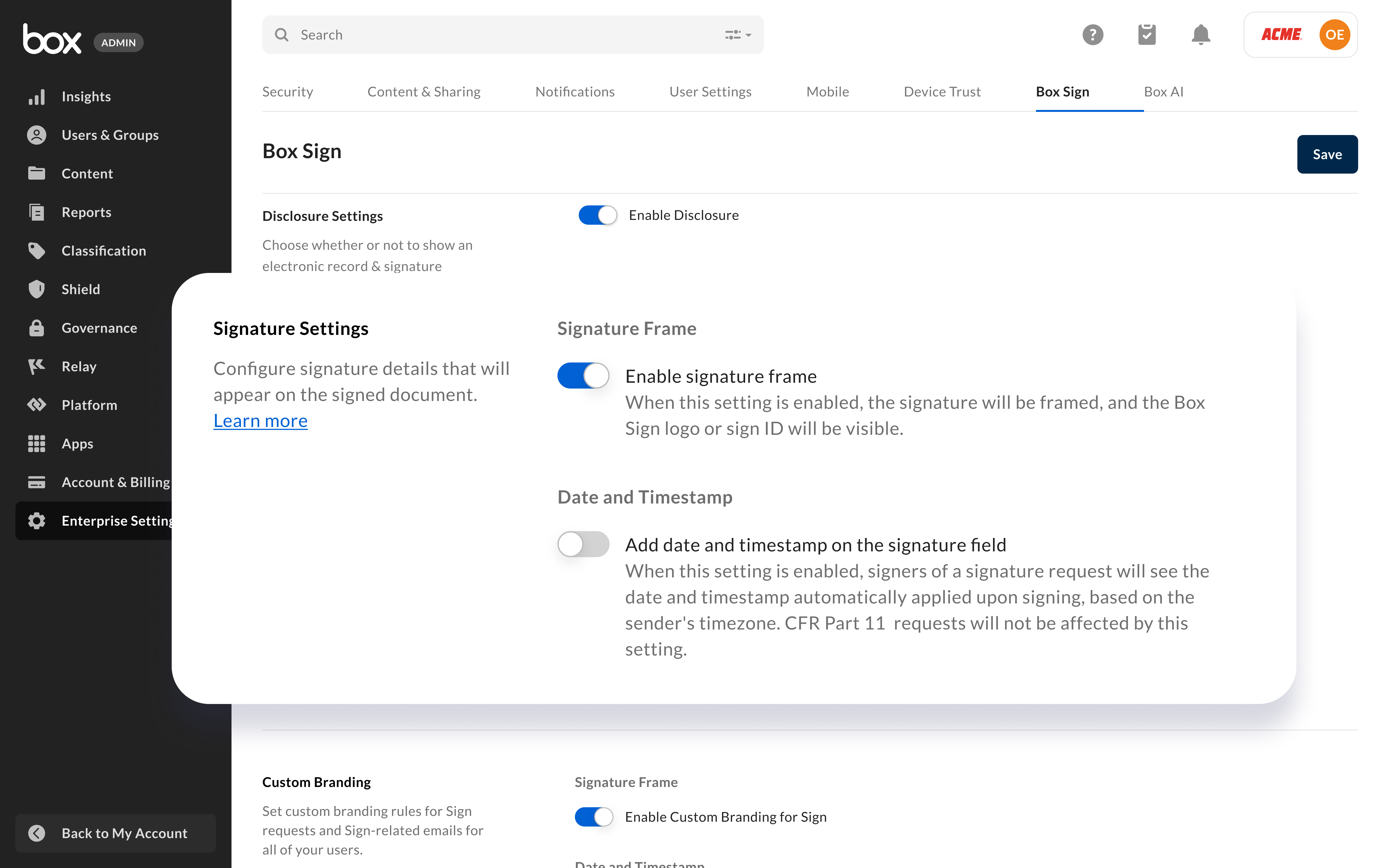 We released the ability to automatically include the date and timestamp within the signature frame any time a recipient applies their e-signature to a signature request. Additionally, Admins and Co-Admins can determine whether to disable or enable the entire signature frame altogether, including the signature request ID and Box Sign logo. These features are controlled by settings that are configured within the Admin Console by Admins or Co-Admins.