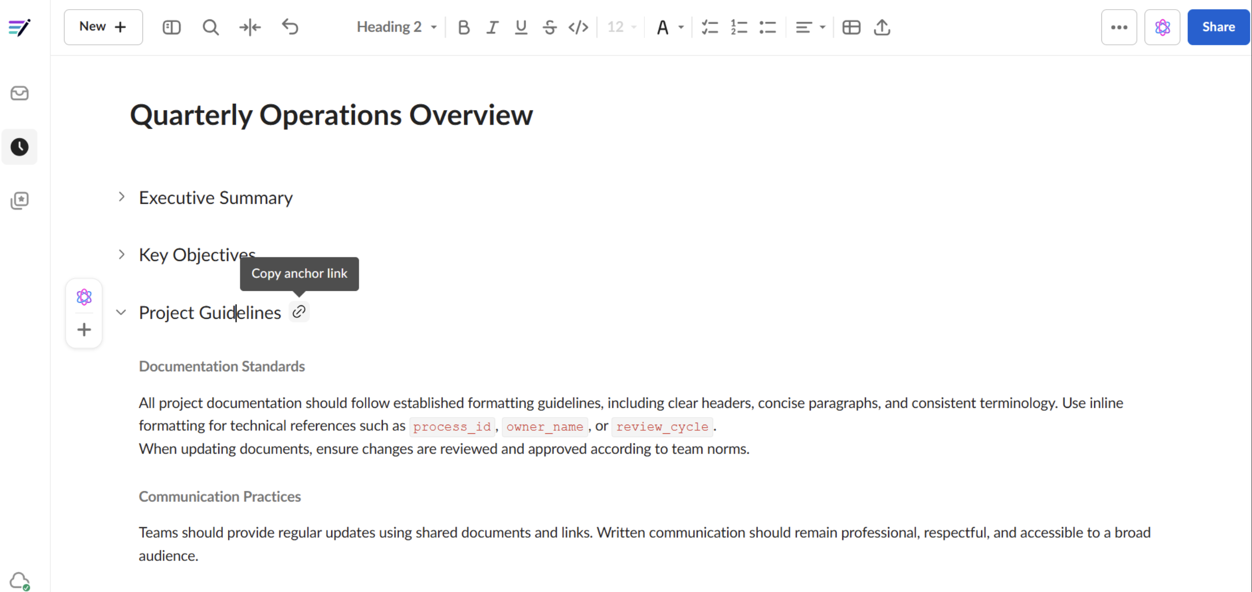 Anchored links let you link directly to specific sections of a note internally and externally, while collapsible headers help you organize long documents and focus on what matters most. Inline code formatting makes it easier to document technical details clearly, and you can use either ``, a styling button in the header, a shortcut, or simply copy-paste the inline code from other apps or web pages. The new Undo/Redo buttons provide quick, visible control over recent edits. You can also open a note in a new tab by using Ctrl/Cmd + click for improved multitasking and share content more easily with URL-based shared links that you copy directly directly from the browser every time after the shared link has been created once.