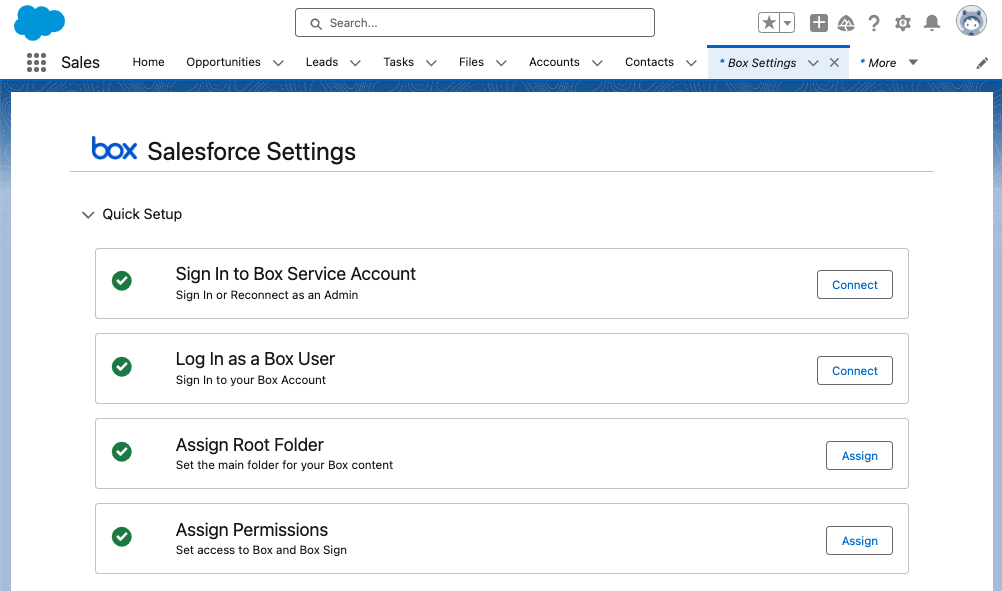 - In the Salesforce App Launcher, search for and navigate to Box Settings.