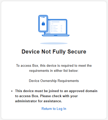 The following message appears: “This device must be joined to an approved domain to access Box.”