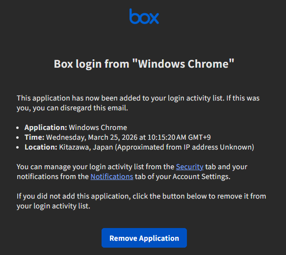 In general, Box sends this notification when the sign-in looks like it is coming from a new device in your login activity.