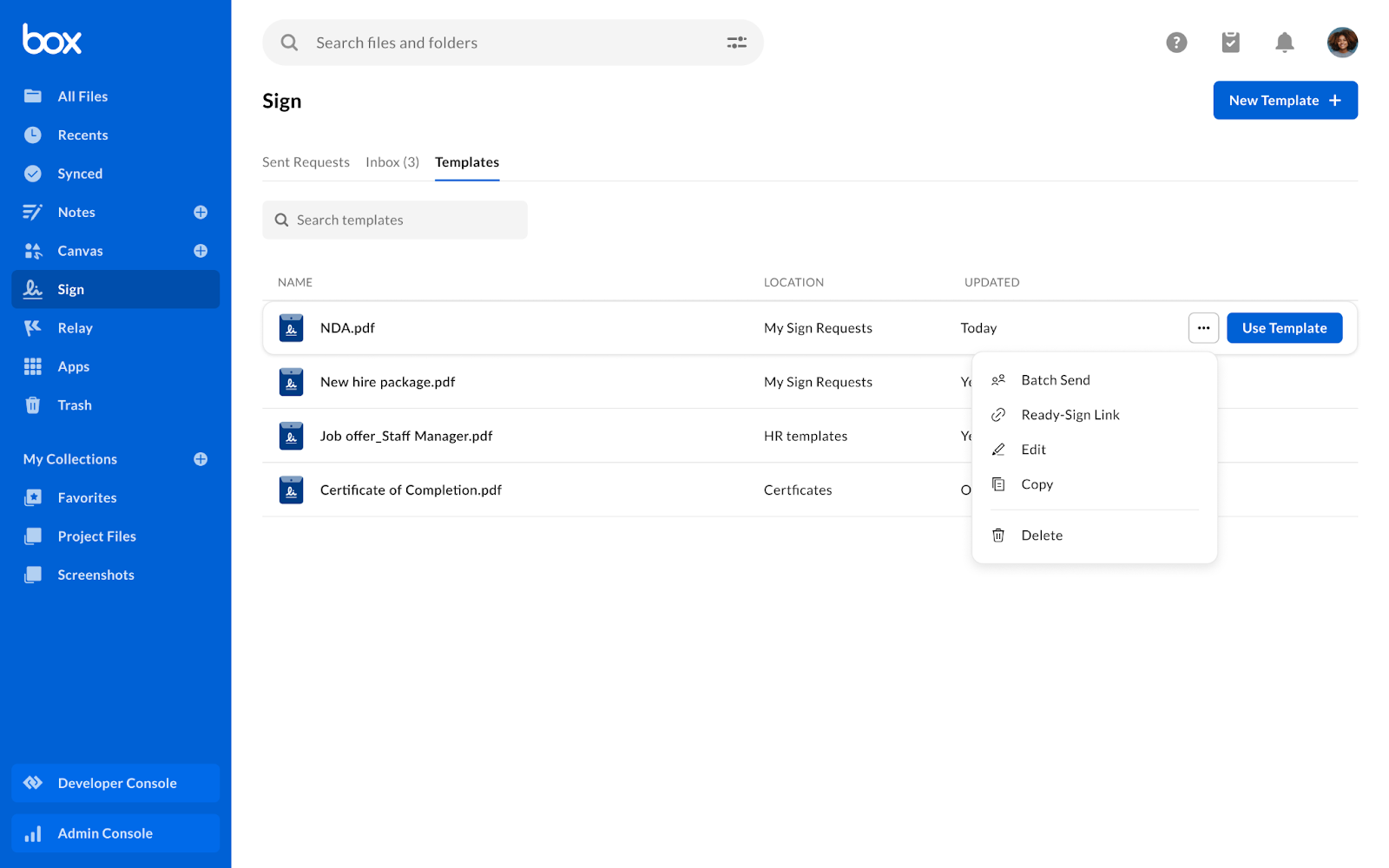 - Box displays a list of sent signature requests that use your template, including those sent as Ready-Sign links.
