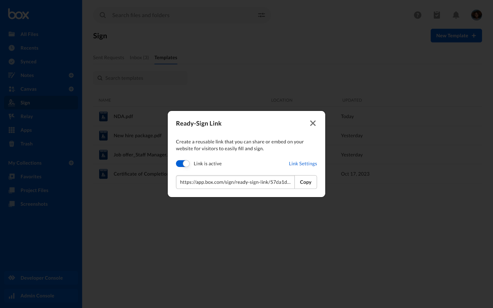 Box's ready-sign link feature allows you to create fillable, signable templates accessible via a shareable hyperlink or embedded on a website, enabling multiple users to easily complete signature requests. The template will need to meet certain requirements to be leveraged as a ready-sign link.