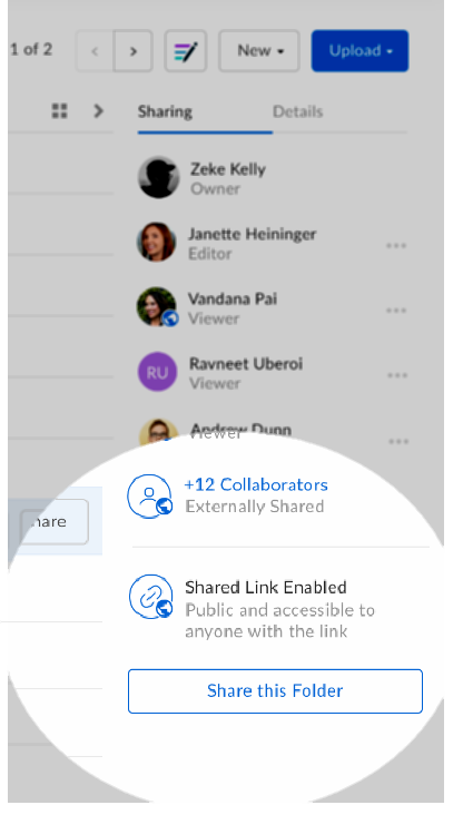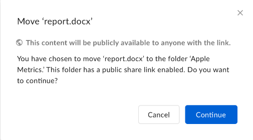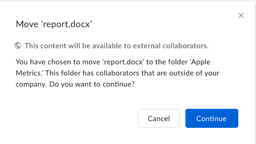 Pour vous aider à éviter de divulguer par inadvertance des informations sensibles à un public plus large que prévu et vous permettre de comprendre rapidement et clairement avec qui vous collaborez ou partagez réellement, Box affiche une série d'indicateurs et d'avertissements. Grâce à ces indicateurs, vous pouvez distinguer visuellement et rapidement si vous partagez du contenu en externe et si le contenu sur lequel vous travaillez sera accessible au public via des liens partagés. Utilisez-les pour identifier à l'avance si vous avez spécifié une destination ou un collaborateur approprié, et également comme une opportunité de changer d'avis avant de terminer une action sur un fichier ou un dossier.