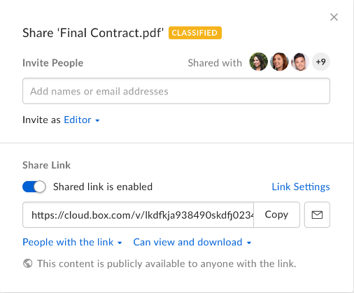 Lorsque vous partagez du contenu via un lien public, dans la boîte de dialogue Partage , Box vous rappelle que ce contenu sera accessible au grand public :