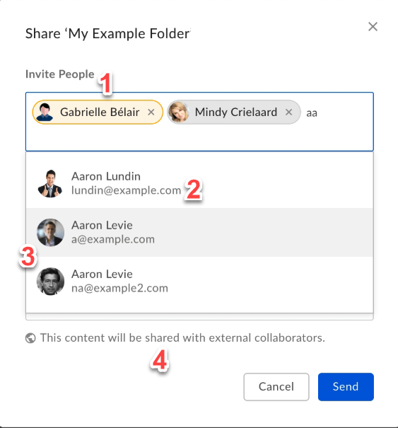 Lorsque vous partagez du contenu avec une personne extérieure à votre organisation, dans la boîte de dialogue Partage, Box affiche les éléments suivants :
