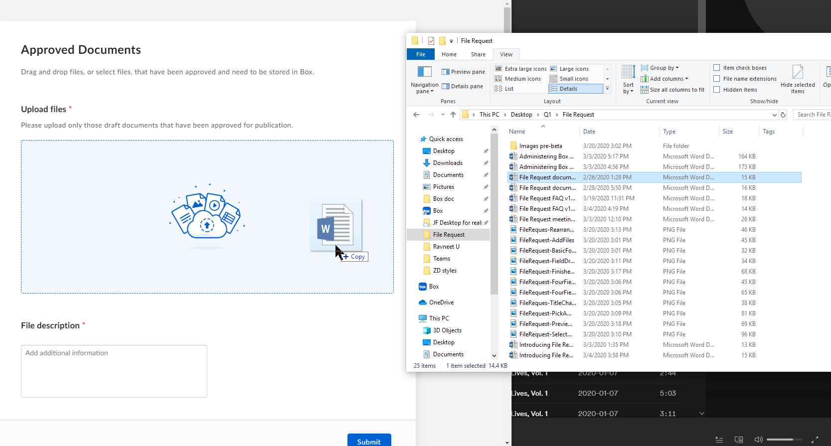 Une fois l'opération terminée, ils cliquent sur Soumettre . À chaque téléchargement de fichier, Box capture automatiquement l'adresse e-mail utilisée pour se connecter. Et au bas du formulaire, Box affiche la progression du téléchargement.