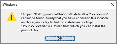 ユーザーがBox Driveを起動またはアンインストールしようとしたときに、エラー通知「パス ‘C:\ProgramData\Box\Box\Installer\Box.2.xx.xxx.msi’ が見つかりません」が表示されます。 この問題は、システムがBox Driveの修復を試みたものの、必要なインストーラパッケージ (.msiファイル) が見つからなかったときに発生します。 この問題はBox Driveの機能に影響し、起動やアンインストールを正常に実行できなくなります。