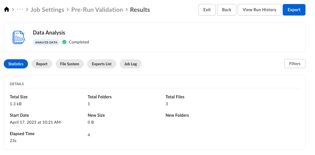 実行前の検証を行うと、分析またはスキップすることを選択したデータとジョブ設定を示すサマリーが表示されます。 分析に進む前にこれらが正しいかどうかを確認します。