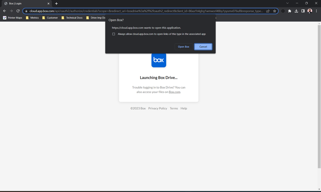 ログインに成功すると、ユーザーはBox Driveアプリケーションを開くよう求められます。 そのメッセージが表示されたら、[Boxを開く] をクリックします。 |