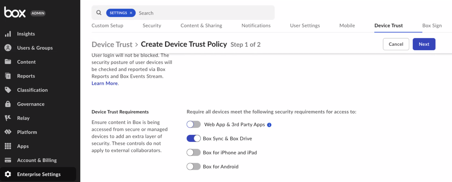 リリース開始は11月頃を予定しています。Box Driveとデバイストラストが有効なすべてのお客様には、ユーザーのサービス中断のリスクを回避するため、要件 (下記参照) を確認して必要な手順を行うことをお勧めします。 特に、Box Driveエンドポイントのデバイストラストチェックを有効にしている場合は (下の画像参照、[Box SyncおよびBox Drive] がオン)、Box Toolsをインストールする必要があります。 すでにBox Toolsがインストールされている場合、追加の更新は不要です。 Box Toolsがインストールされていない場合は、下記の要件に従って最新のBox Toolsをインストールする必要があります。
