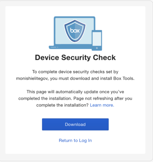 Box Driveユーザーがログインを完了するには、Box Toolsでデバイストラストチェックを実行する必要があります。 Box Toolsがない場合、ログイン時にデバイストラストチェックが失敗し、ログインを完了するにはBox Toolsが必要であることを示すメッセージが表示されます。