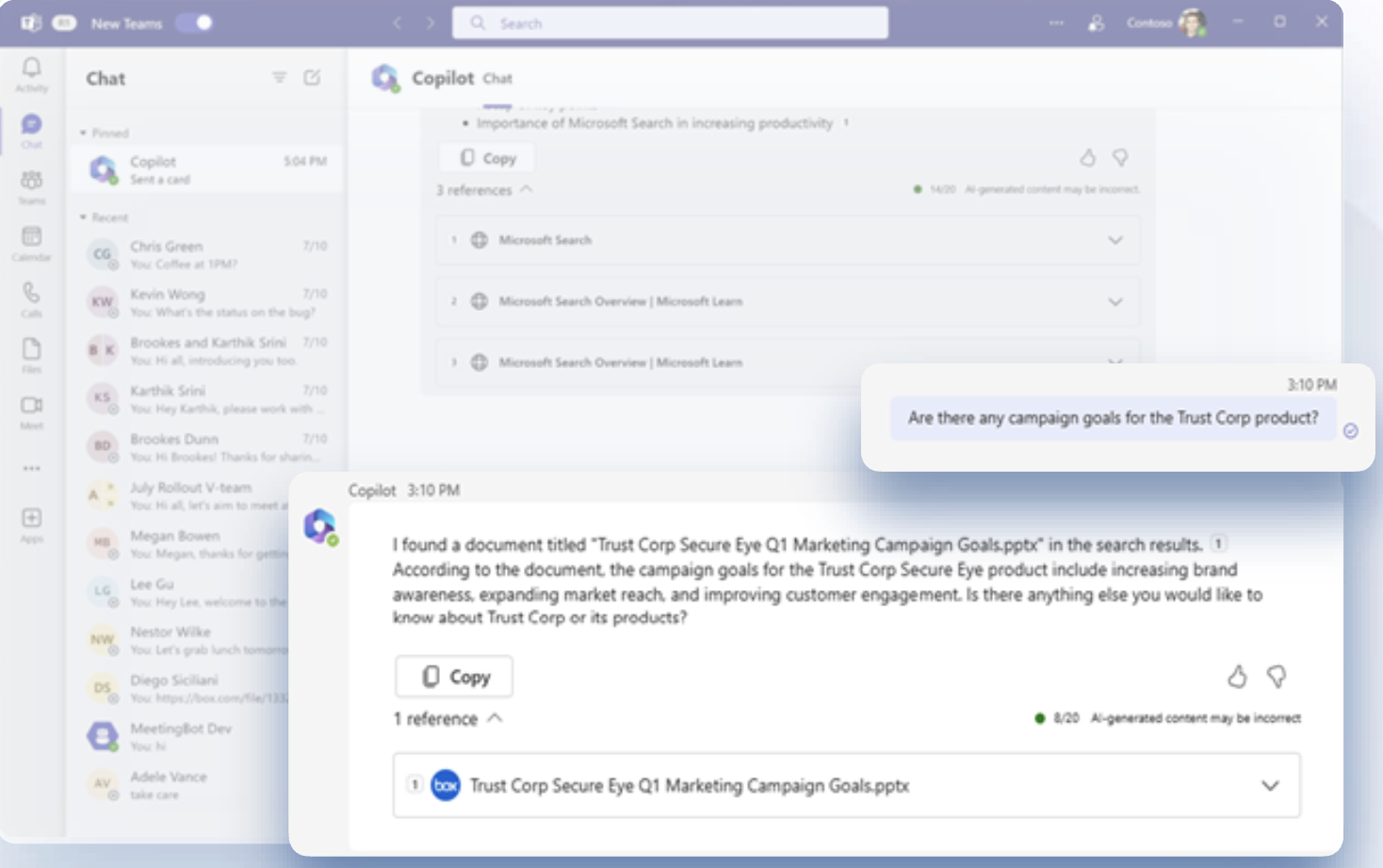 この最初の機能強化では、Microsoft Teams、Microsoft365.com、copilot.microsoft.comなどで広く活用できるBox Connector for Microsoft Graph*を利用して、ユーザーがMicrosoft Copilotを通じて簡単にBoxコンテンツにアクセスし、インサイトを得ることができるようになりました。