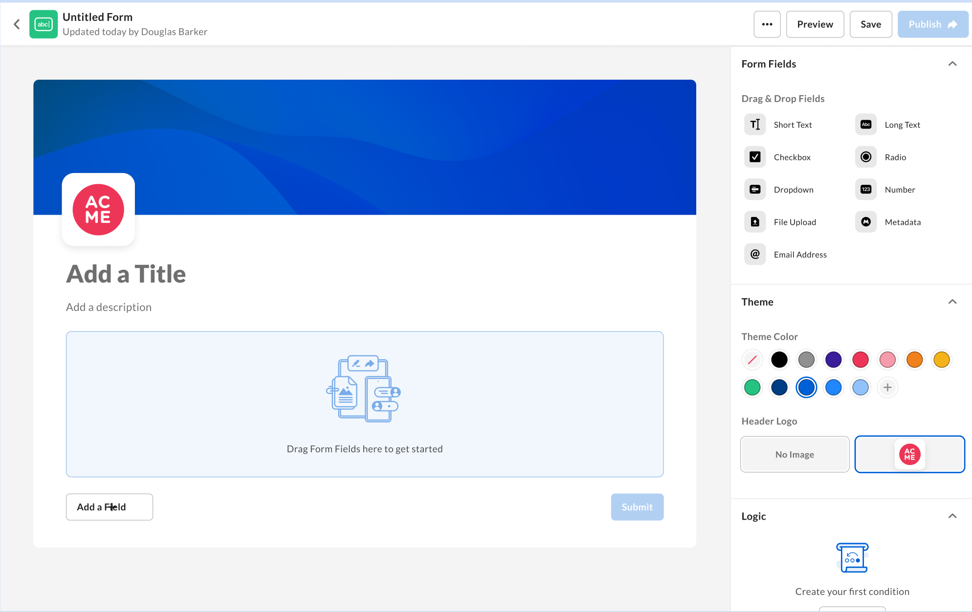 フォーム内のロジックは、ユーザーの入力に基づいて動的に調整できるので、より適切で、入力しやすいフォームを作成できます。 フィールドを表示または非表示にする条件を設定したり、さらにカスタマイズするために特定のロジックを追加したりできます。