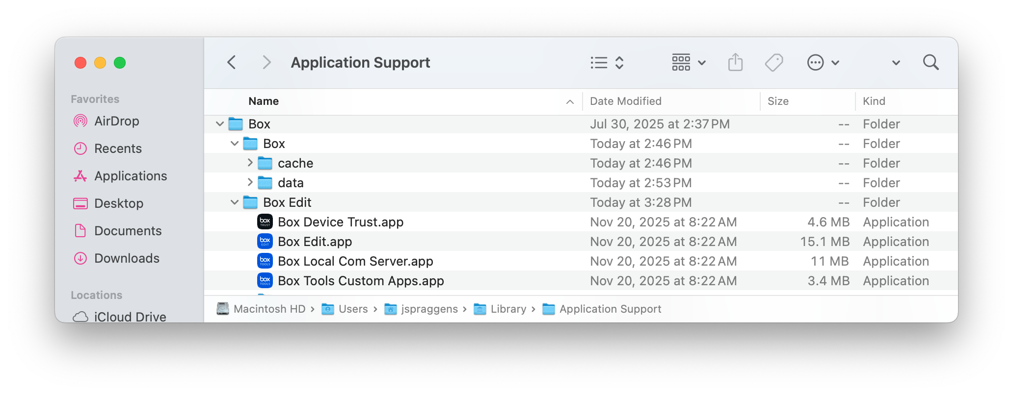 - [Macintosh HD] > [Users] > <ユーザー名> > [Library] > [Application Support] > [Box] を開きます。
