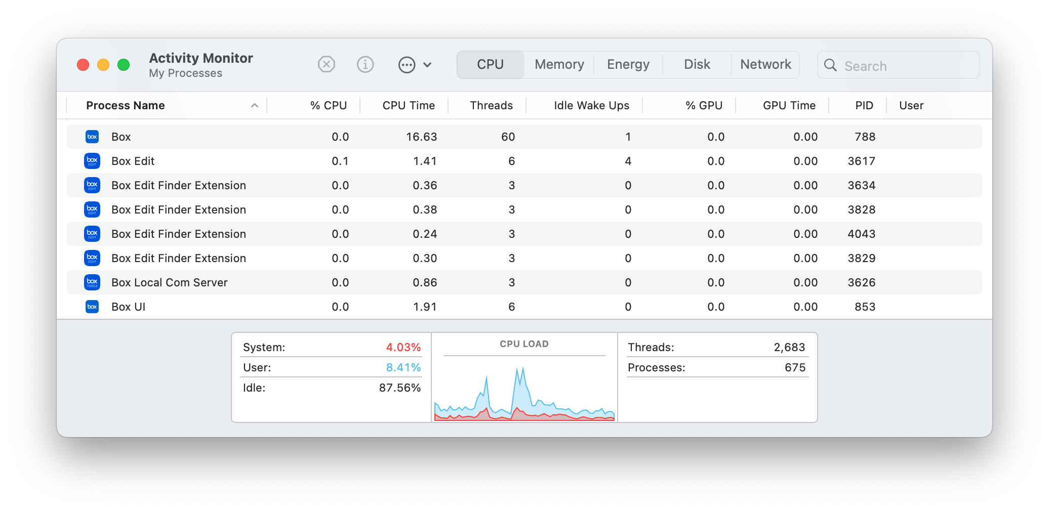 - [バックグラウンドプロセス] に [Box Edit] と [Box Local Com Service] の両方が表示されているはずです。