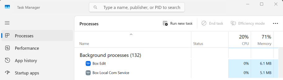 - [バックグラウンドプロセス] に [Box Edit] と [Box Local Com Service] の両方が表示されているはずです。