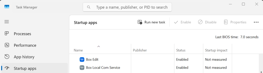 - 管理者がMSIインストーラを使用してBox Toolsをインストールした場合、Local Com Serviceは、([スタートアップ] タブには表示されない) サービスとして実行されます。そのため、services.mscを使用して、実行されていることを確認し、必要に応じてITチームにお問い合わせください。