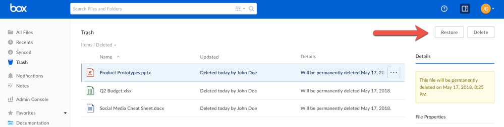 Boxでは、ごみ箱に入れたファイルやフォルダが一定期間保存されます。 デフォルトではその期間は30日間ですが、BusinessアカウントとEnterpriseアカウントのBox管理者であればその期間を調整できます。Boxのごみ箱内の項目でも、Boxアカウントの元の場所に復元することができます。また、ごみ箱を検索して、特定の項目を手動で復元または削除することもできます。