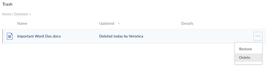 - 削除したファイルまたはフォルダのコラボレータから削除されると、ごみ箱にその項目が表示されなくなります。 ごみ箱にその項目を表示するには、もう一度その項目のコラボレータとして追加してもらう必要があります。