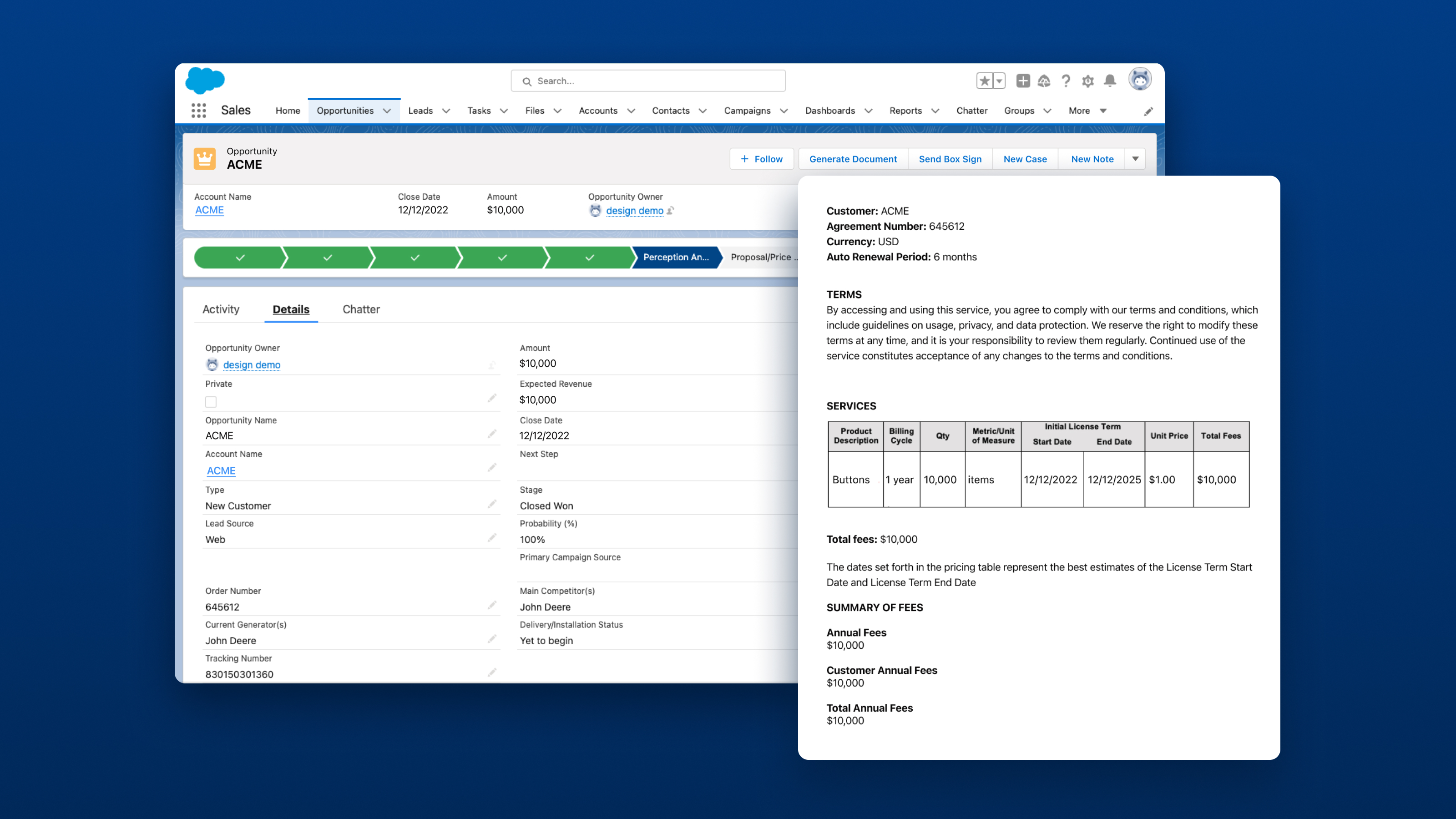 Box for Salesforceの管理パッケージの一部として、Box Doc Genは、Boxで事前に構成されたBox Doc Genテンプレートを自動的に選択し、Salesforceオブジェクトからデータをマージし、Salesforceですぐに利用できるカスタムドキュメントを生成するよう設計されています。 Box Signと組み合わせると、チームはSalesforceから離れることなく、ドキュメントを自動的に生成し、電子サイン用に送信して、プロセス全体を追跡できます。