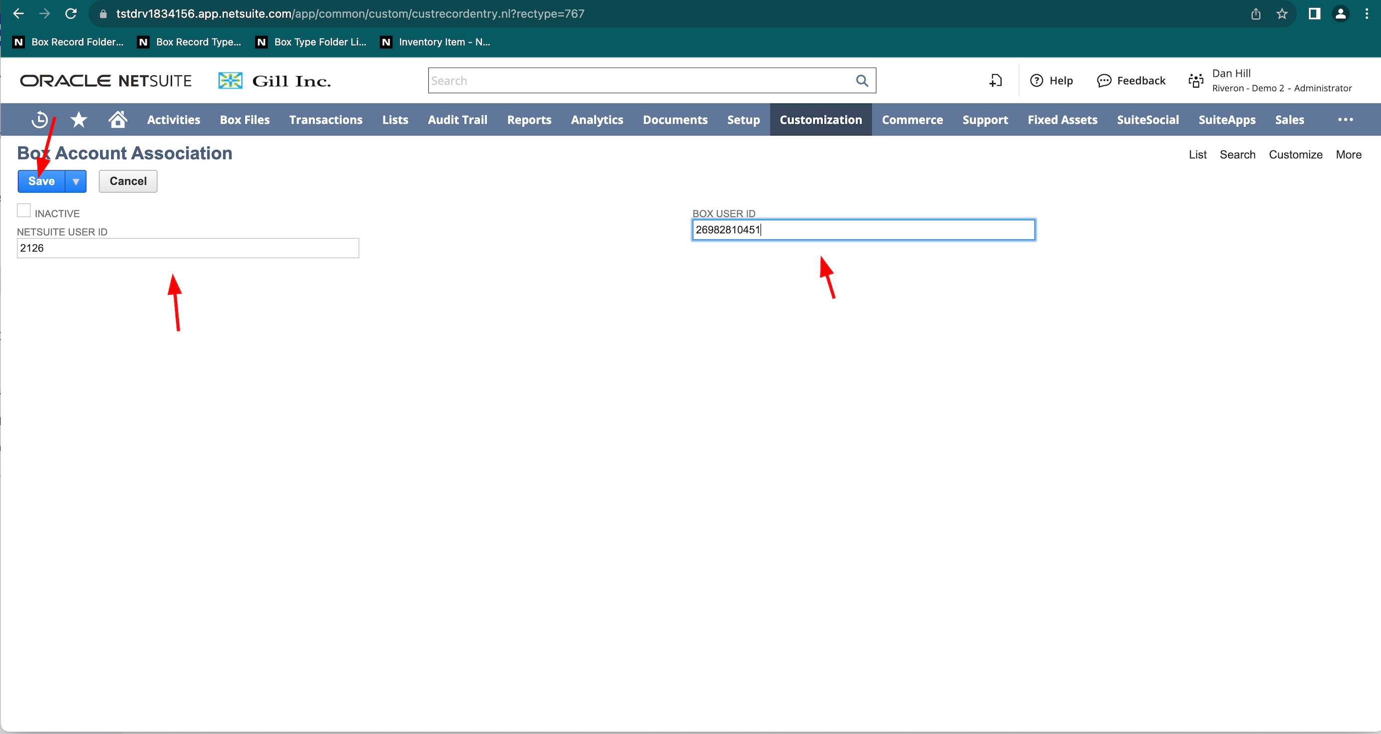 - それぞれのフィールドにNetSuiteユーザーIDとBoxユーザーIDを入力します。 [Save] をクリックします。