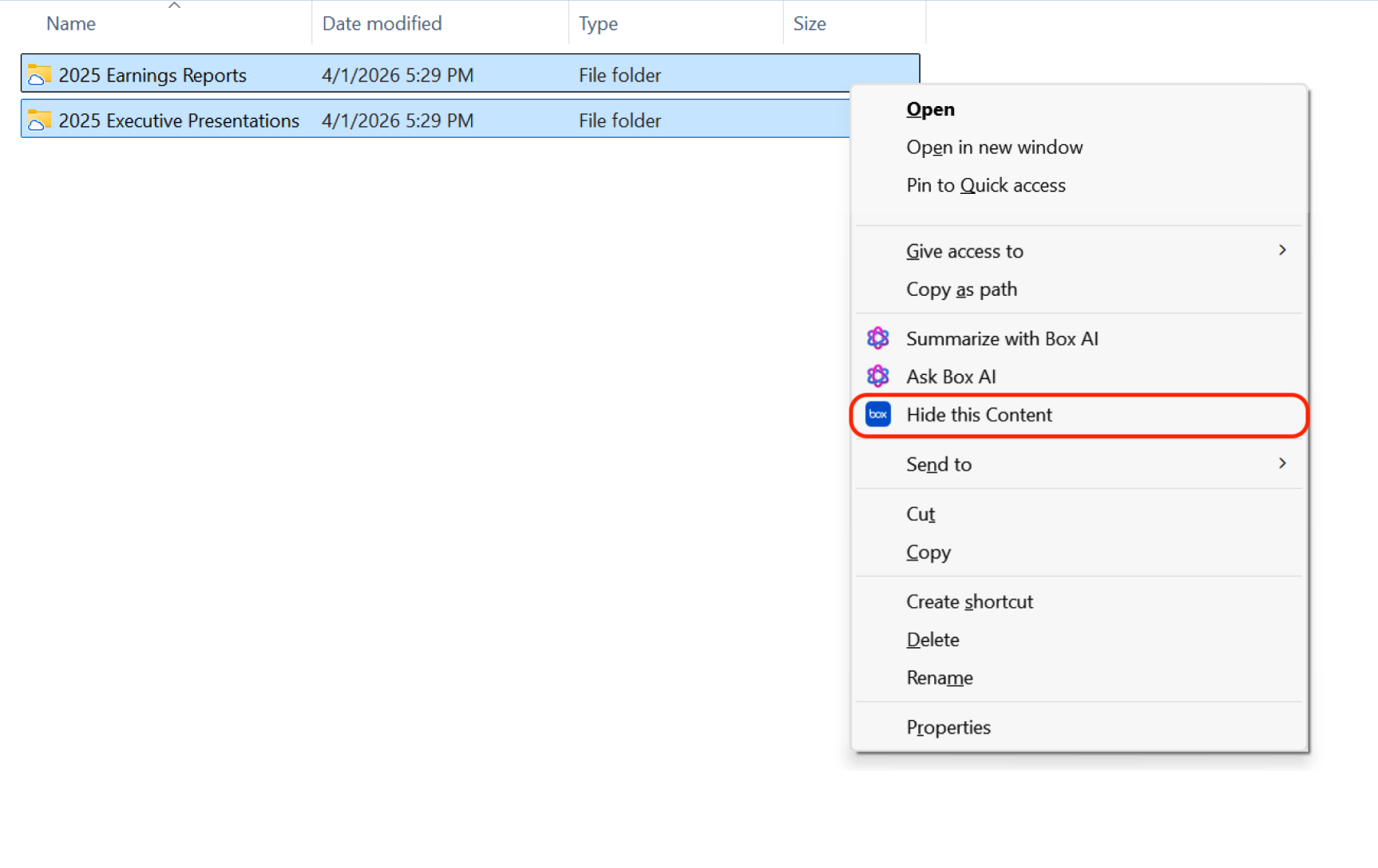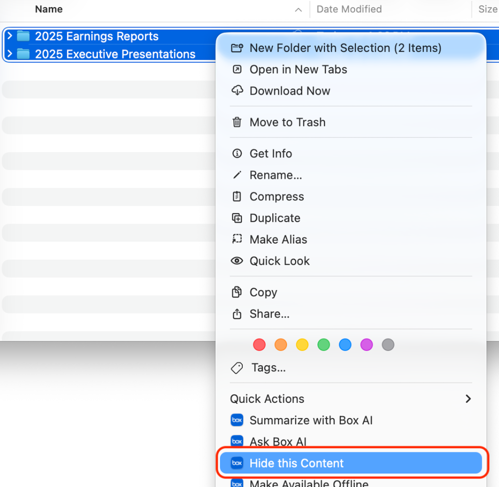Box Driveでのファイルやフォルダの非表示機能が改善され、 WindowsのエクスプローラまたはmacOSのFinderウィンドウで複数の項目を選択し、それらすべてを一度に非表示にできるようになりました。 これまでと同様、非表示にしたファイルまたはフォルダは、ローカルのBoxフォルダツリーから見えなくなるため、アクティブな作業を見つけやすくなりますが、Boxアカウントには残っています。つまり、クラウドに安全に保存されており、Box.comで使用することも、Box Driveで引き続き検索することも可能です。