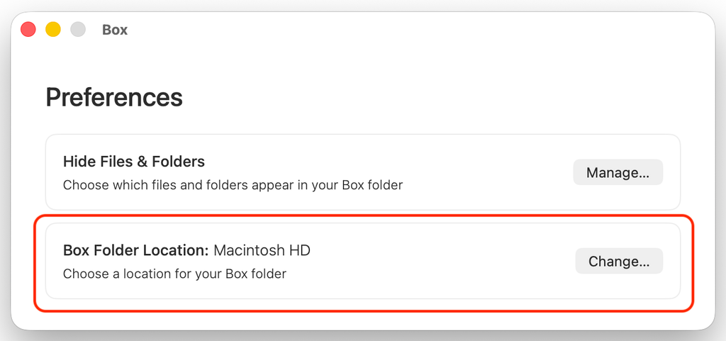 新機能である外部ドライブのサポートにより、Macユーザーは、Box Driveディレクトリを外部ドライブに移動できるようになります。 これにより、マシンのローカルディスク容量に制限されることなく、サイズの大きなファイルまたは大量のファイルやフォルダを操作できます。 Box Driveディレクトリの配置場所は、Box Driveの [設定] メニューで構成できます。