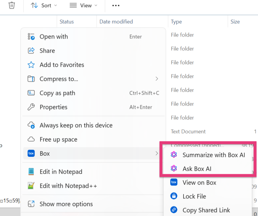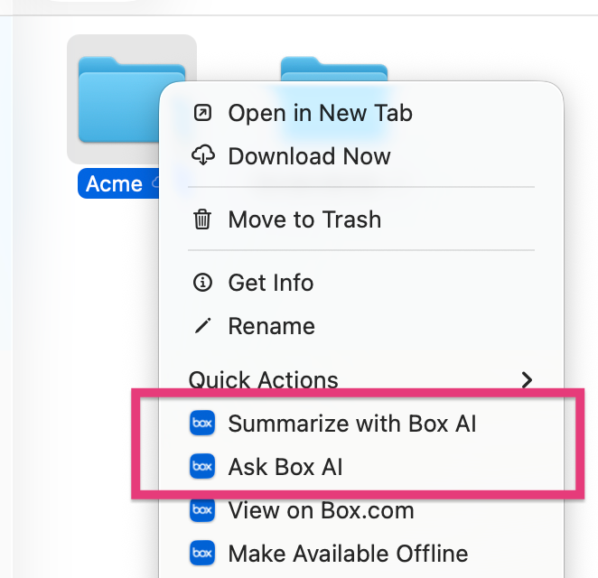 Box Driveの右クリックのコンテキストメニューから、Box Driveを直接利用できるようになりました。 ユーザーは、デスクトップから直接、ファイルに対して質問や要約の取得を実行できます。 アプリを切り替えることなくよりスマートに作業できる、2つの新しいオプションをご利用いただけます。